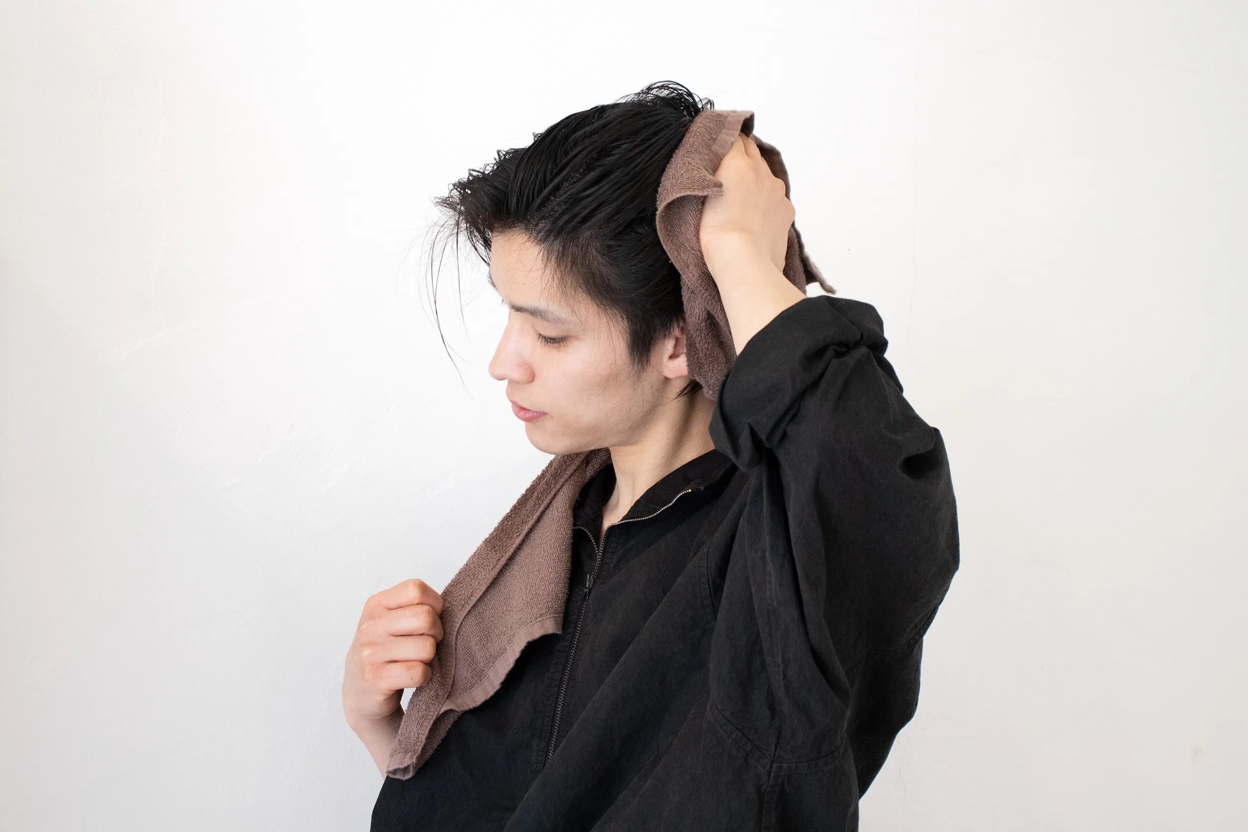 髪をにぎって水がしたたり落ちない程度にタオルドライをします。均一に髪へ塗るためにしっかり手のひらにのばし、毛先→中間→根元付近の順につけていきます。