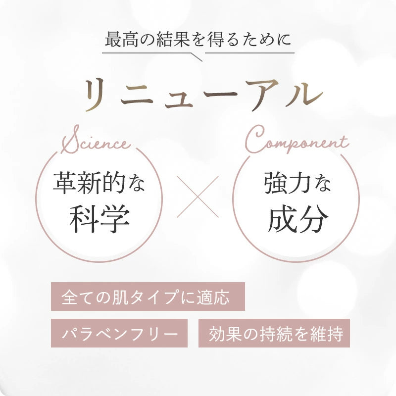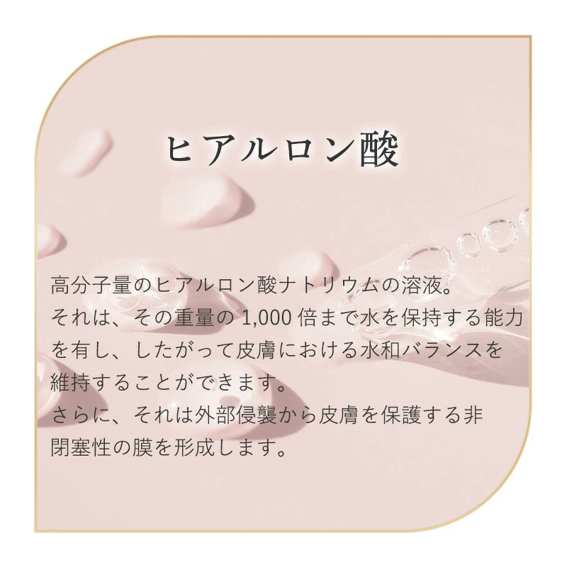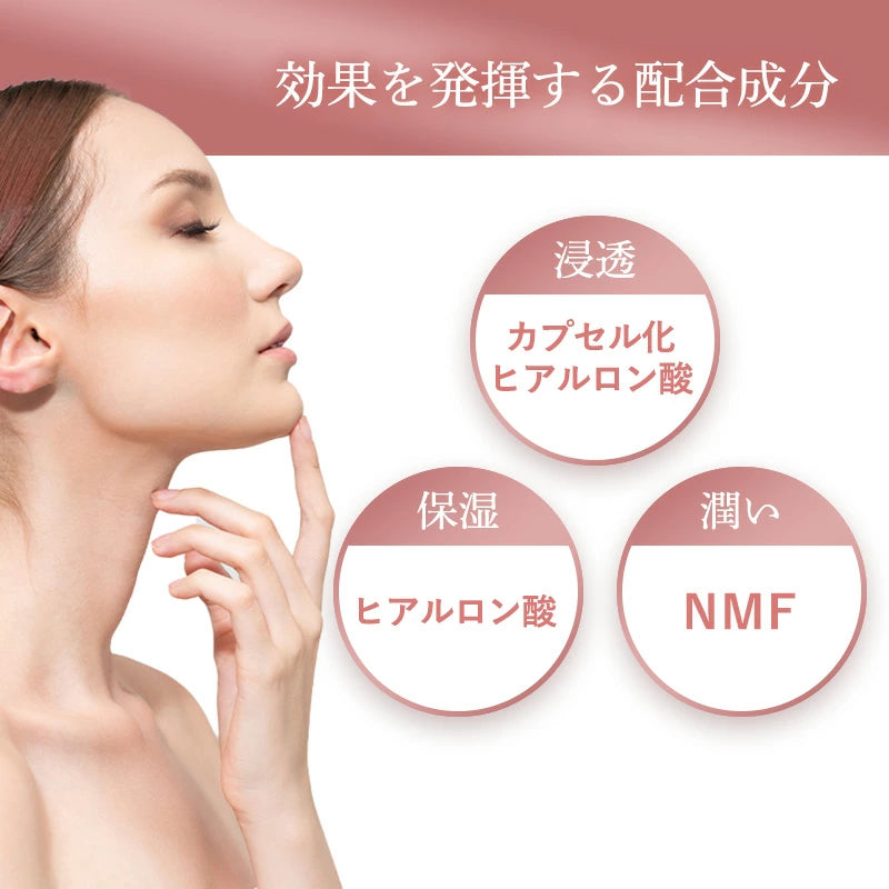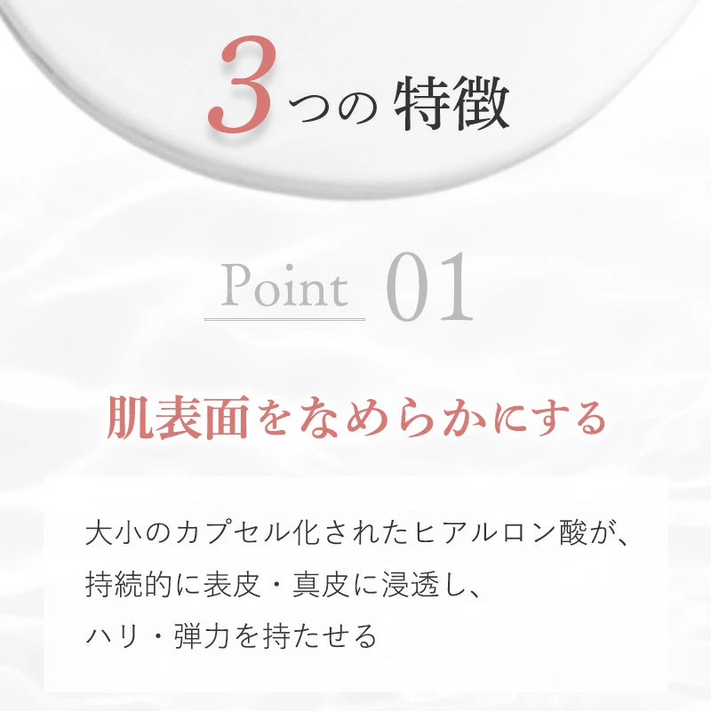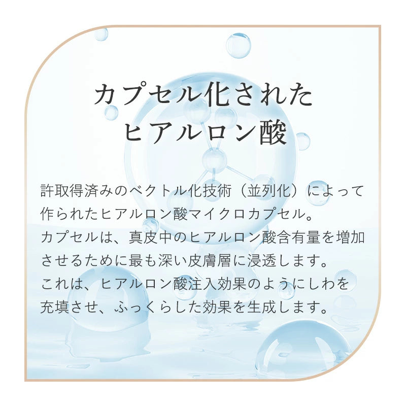 特許取得済みのベクトル化技術(並列化)によって作られたヒアルロン酸マイクロカプセル。カプセルは、真皮中のヒアルロン酸含有量を増加させるために最も深い皮膚層に浸透します。これは、ヒアルロン酸注入効果のようにしわを充填させ、ふっくらした効果を生成します。