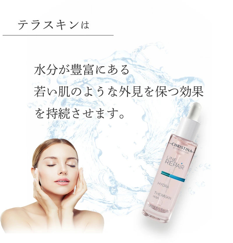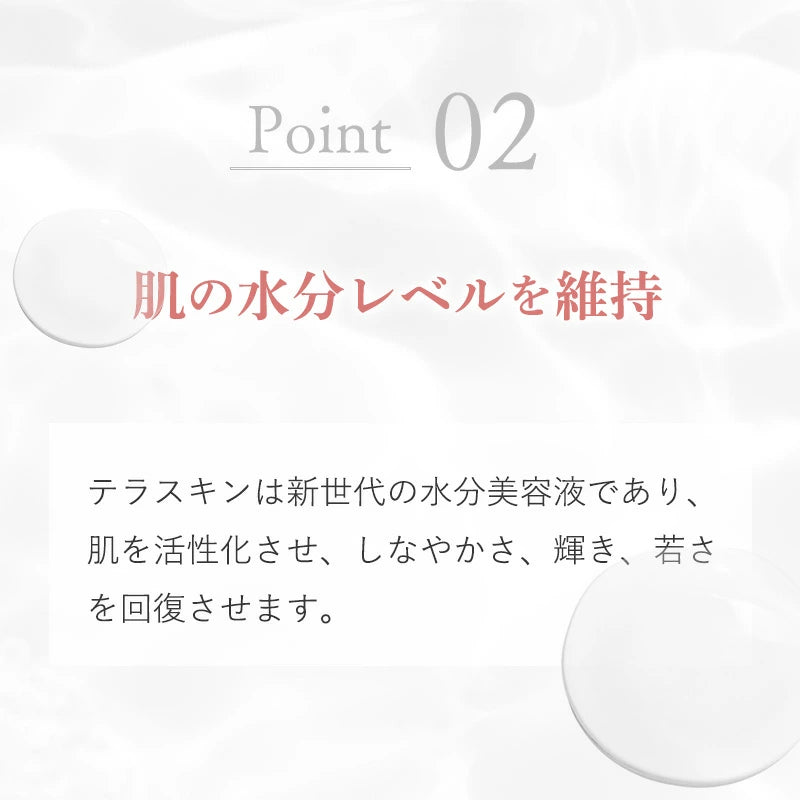 テラスキンは新世代の水分美容液であり、肌を活性化させ、しなやかさ、輝き、若さを回復させます。それは肌へ水のような質感を与え、肌になじみよく、急速に角質層まで吸収され、水分量のバランスを保ち、老化を抑制します。