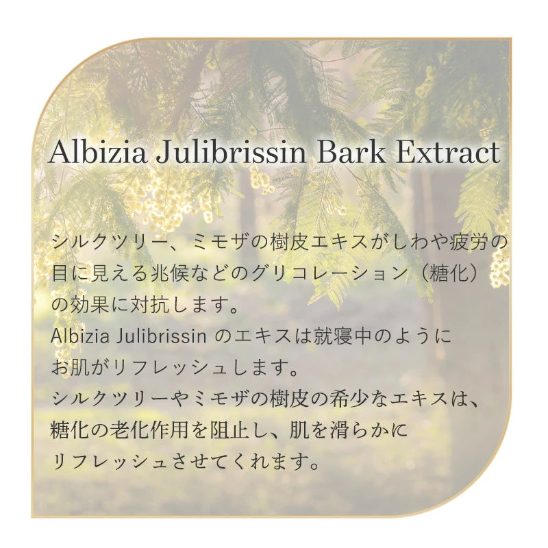 毎日の糖化による疲労の徴候を減少させ、長期的にその蓄積を大きく減少させます。 シルクツリーやミモザの樹皮の希少なエキスは、糖化の老化作用を阻止し、肌を滑らかにリフレッシュさせてくれます。