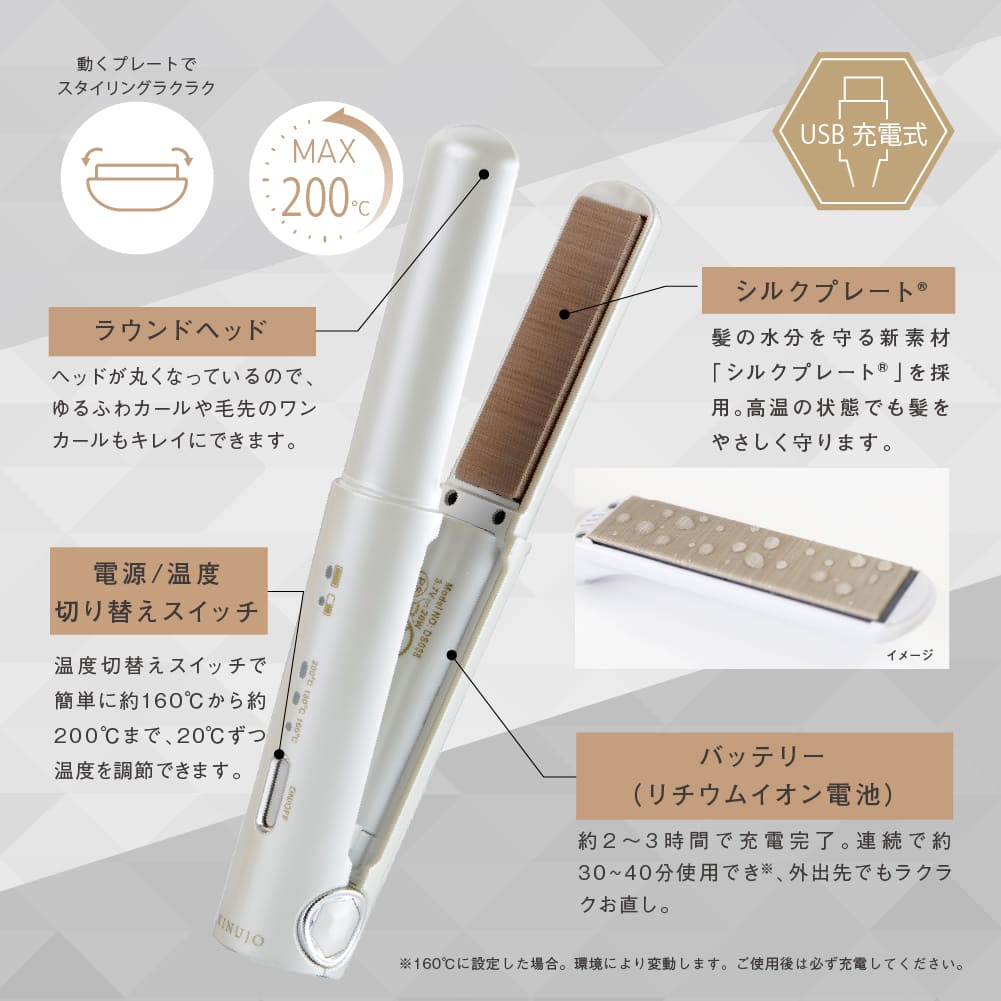 持ち運びにピッタリな充電式(USBケーブル、電源プラグ付き)のアイロンです。電源を入れて3分で約160℃まで温度が上昇!約160~200℃まで20°C単位で設定することができ、約23時間のフル充電で約3040分連続でご使用頂けます。
