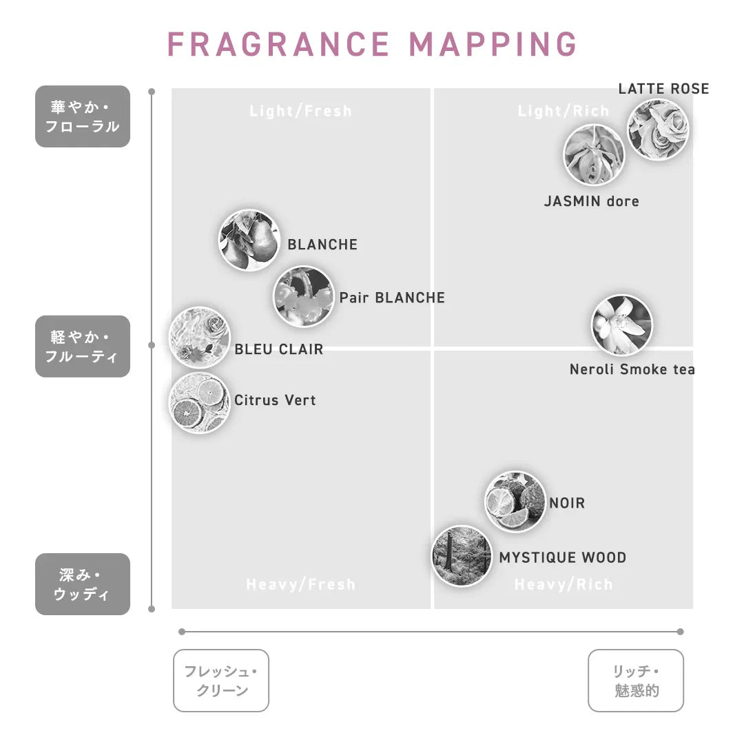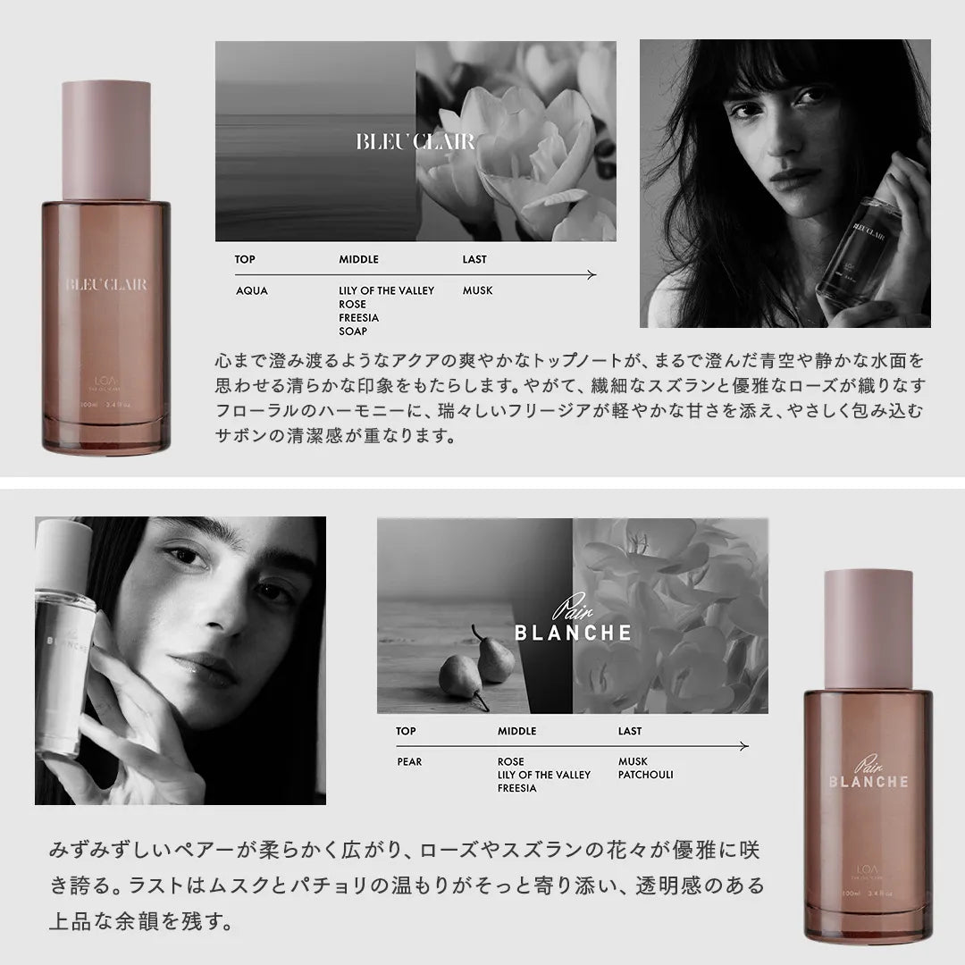 みずみずしいペアーが柔らかく広がり、ローズやスズランの花々が優雅に咲き誇る。ラストはムスクとパチョリの温もりがそっと寄り添い、透明感のある上品な余韻を残す。