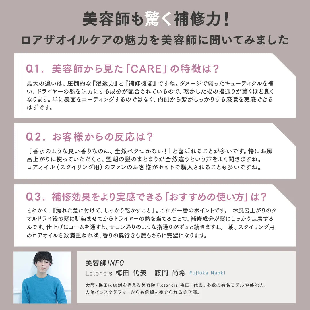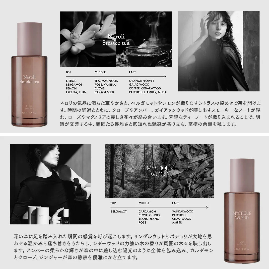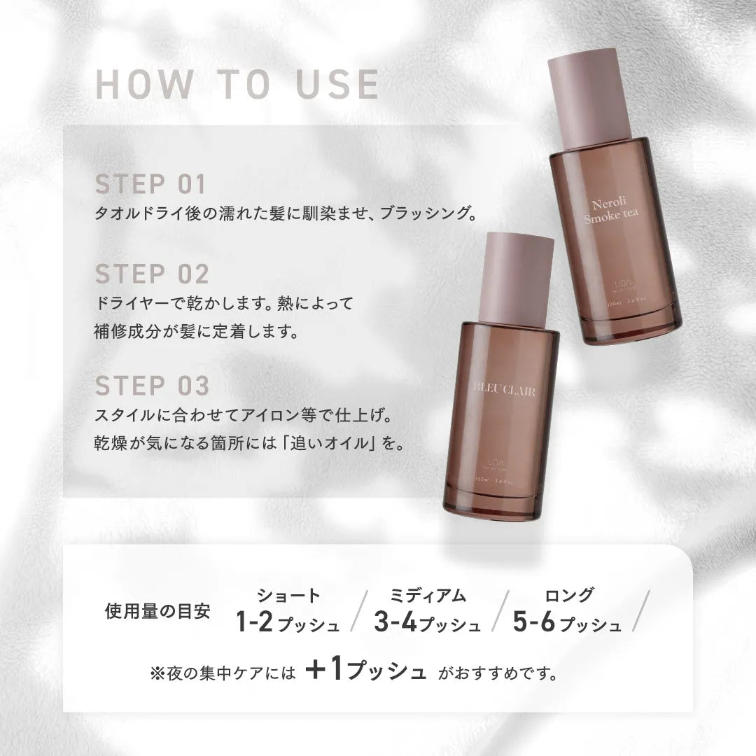 LOA THE OIL “CARE”とLOA THE OILを併用することで香りのレイヤードをお楽しみください。
