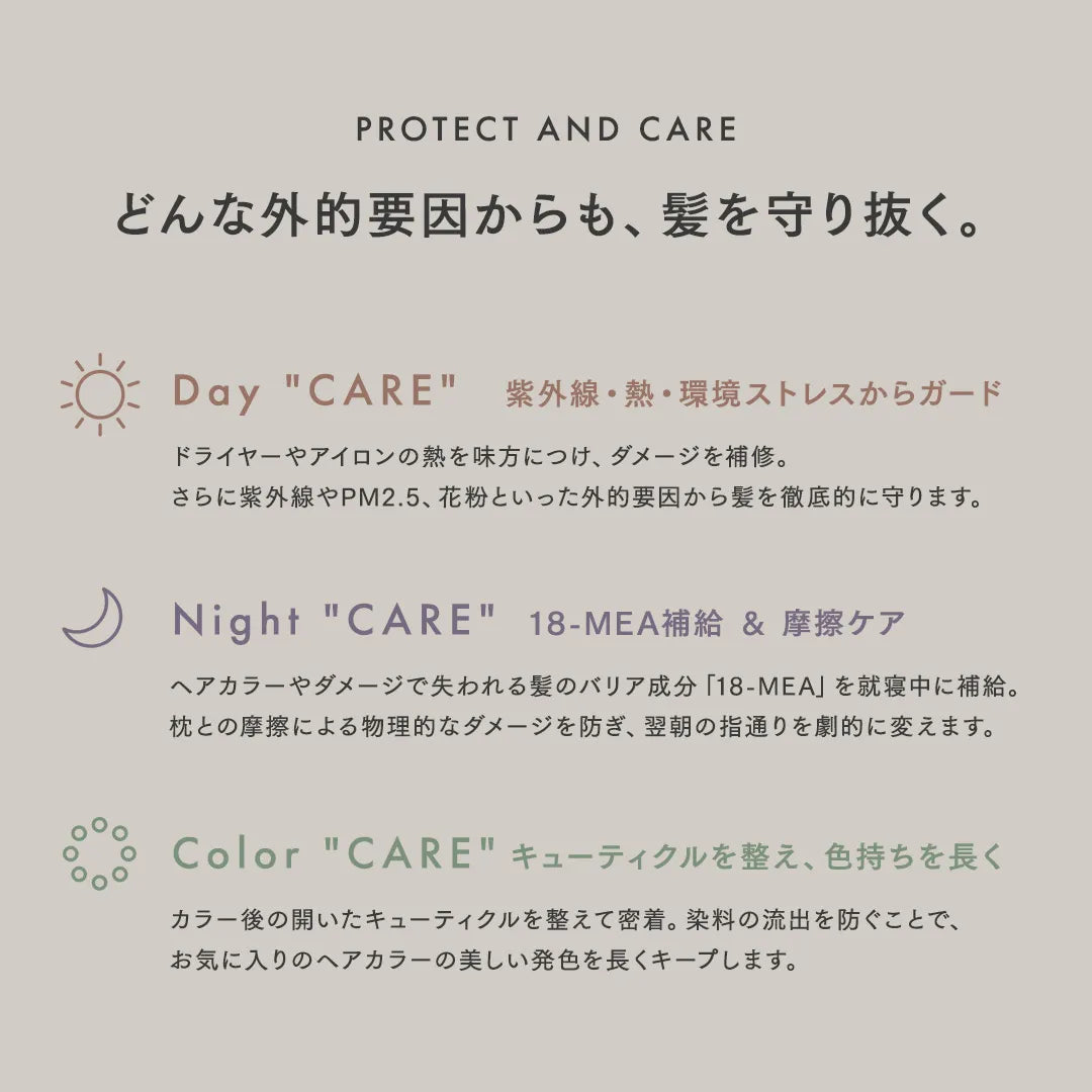 どんな外的要因からも髪を守り、ケアする。