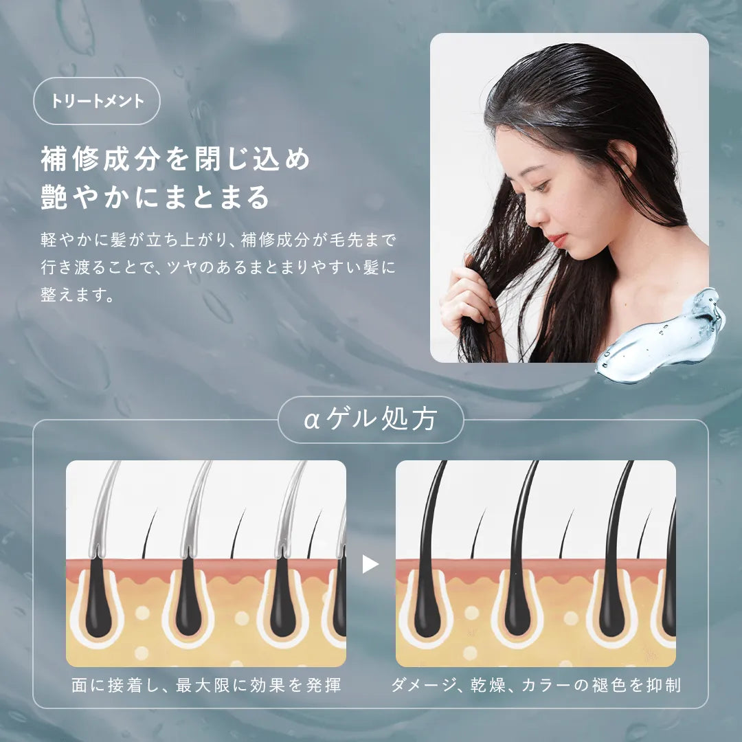 トリートメントには、αゲル処方を採用。シャンプー・トリートメントの補修成分が流れてしまわないよう閉じ込めます。 補修成分が毛先まで行き渡ることで、ツヤのあるまとまりやすい髪に整えます。さらに、根本にまで栄養が行き渡ることで、軽やかに髪が立ち上がる効果も見込める処方です。
