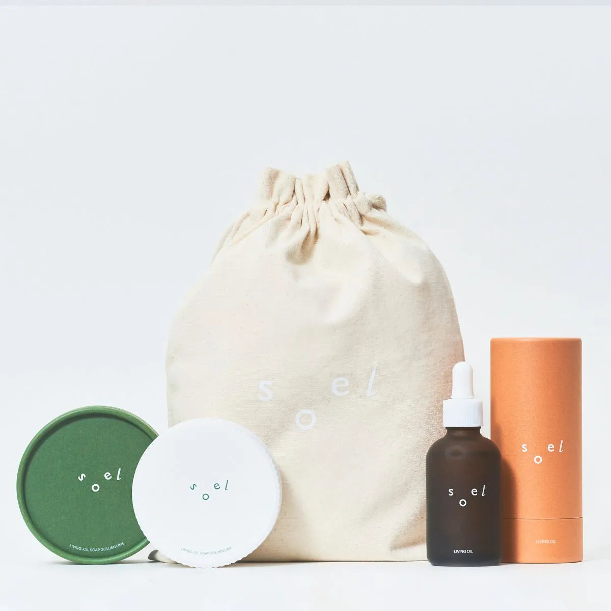 | 内容量 | ・LIVING-OIL ソープ 洗顔生せっけん(ゴールデンライムver.) 100mL ・LIVING-OIL セサミオイル 60mL ・soel オリジナル巾着(レギュラーサイズ) |