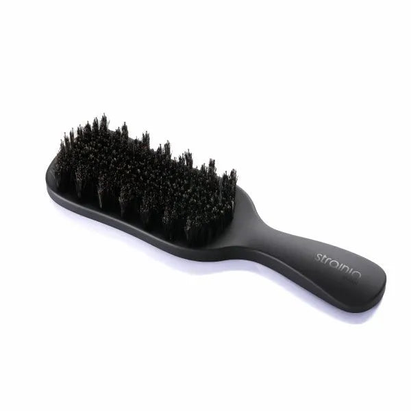 ボディの植毛部分は通常のブラシとは逆向きの内側に湾曲させた設計。頭部の形状に沿う事で、毛髪1本1本に直線的な力がかかりやすくなっています。また、薄型のため内側からも梳かしやすく、柄の部分以外を持っても使いやすく設計されているため、お好みに応じて微妙なコントロールや力加減を可能としています。