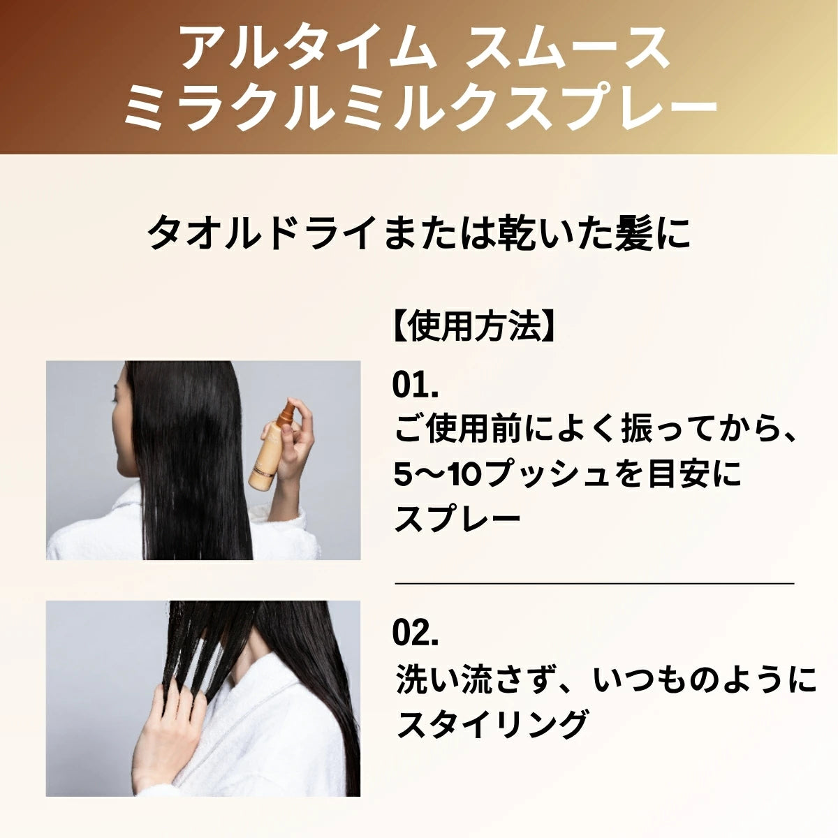 5~10プッシュ、または髪の長さに応じて必要な量を手に取り、髪の中間から毛先まで均一に伸ばします。洗い流さず、毎日ご使用いただけます。