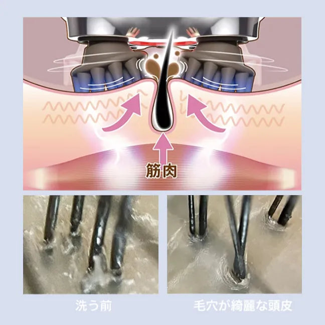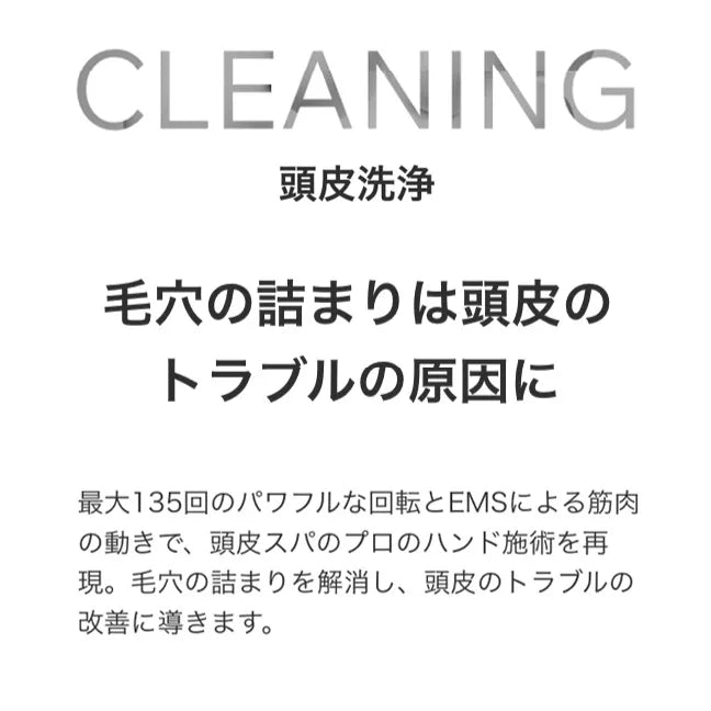 最大135回のパワフルな回転とEMSによる筋肉の動きで、頭皮スパのプロのハンド施術を再現。毛穴の詰まりを解消し、頭皮のトラブルの改善に導きます。