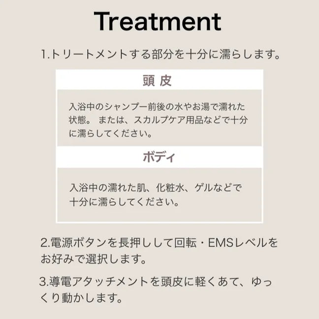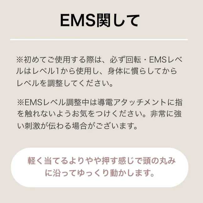 - ※初めてご使用する際は、必ず回転・EMSレベルはレベル1から使用し、身体に慣らしてからレベルを調整してください。