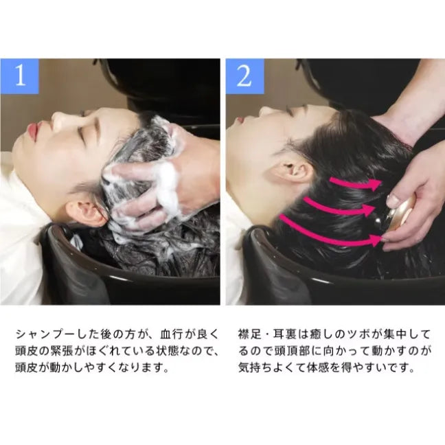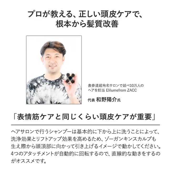 ヘアサロンで行うシャンプーは基本的に下から上に洗うことによって、洗浄効果とリフトアップ効果を高めるため、ゾーガンキンスカルプも生え際から頭頂部に向かって引き上げるイメージで動かしてください。4つのアタッチメントが自動的に回転するので、直線的な動きをするのがオススメです。